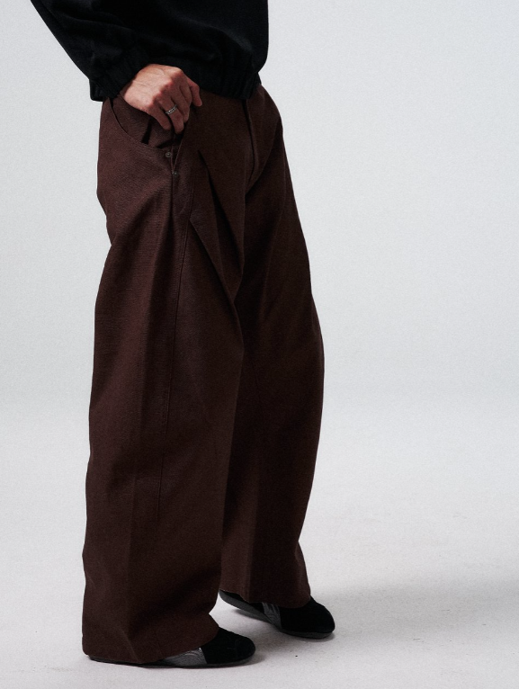 The fabric’s weight and structure allow the trousers to maintain a clean vertical line, while the relaxed wide-leg cut introduces controlled volume through the hip and thigh. Sculpted front pleats are placed with intention, shaping the silhouette and creating a slim, elongated profile when worn.